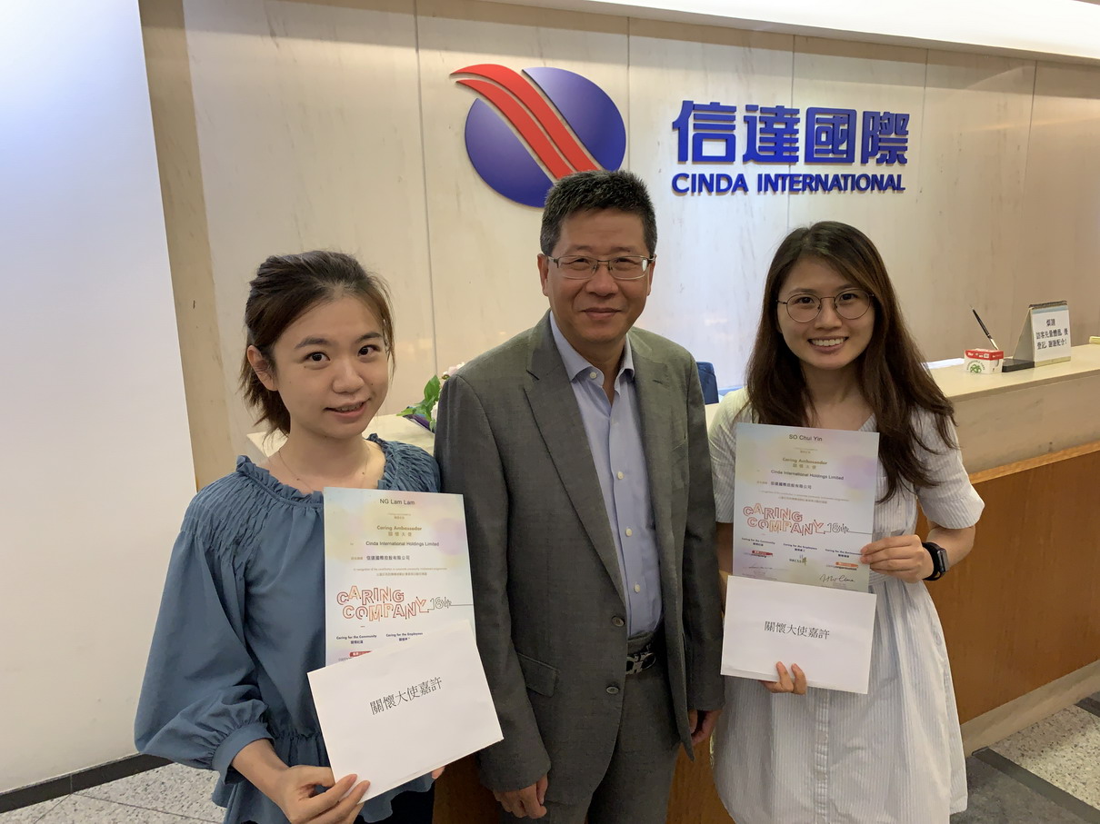 Cinda International has nominated Ms. Letta Ng and Ms. Christine So from Administration Department as Caring Ambassadors of the year in order to recognize their active participation in various social welfare activities and both of them were successfully awarded the “Caring Ambassador” certificates from The Hong Kong Council of Social Service.