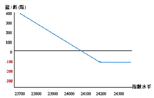 例如: 投資者以100點,買入一張九月份行使價為24200點的恆生指數認沽期權。當恆生指數在到期日跌至23700點,投資者便可賺取期權內在值與期權金的差價400點。相反,在到期日恆生指數在24200點或以上的水平,投資者便會損失已繳付的期權金100點。