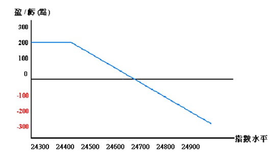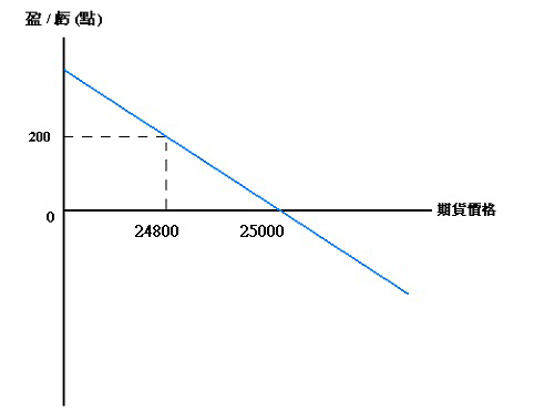 投資者可於25000點賣出二張恆生指數期貨合約,當恆生指數期貨下跌至24800點,投資者便可買入平倉,而獲取每張200點利潤。